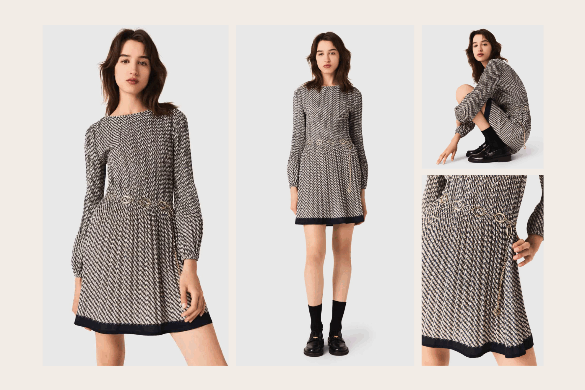 輕盈雪紡搭配百褶設計,胸口鬆緊與下擺設計都充滿細節,整體剪裁俐落。一件洋裝就可能營造出優雅復古造型,適合咖啡約會、周末散步或微醺晚餐。建議可用絲質圍巾或亮色手袋增加秋冬色彩。