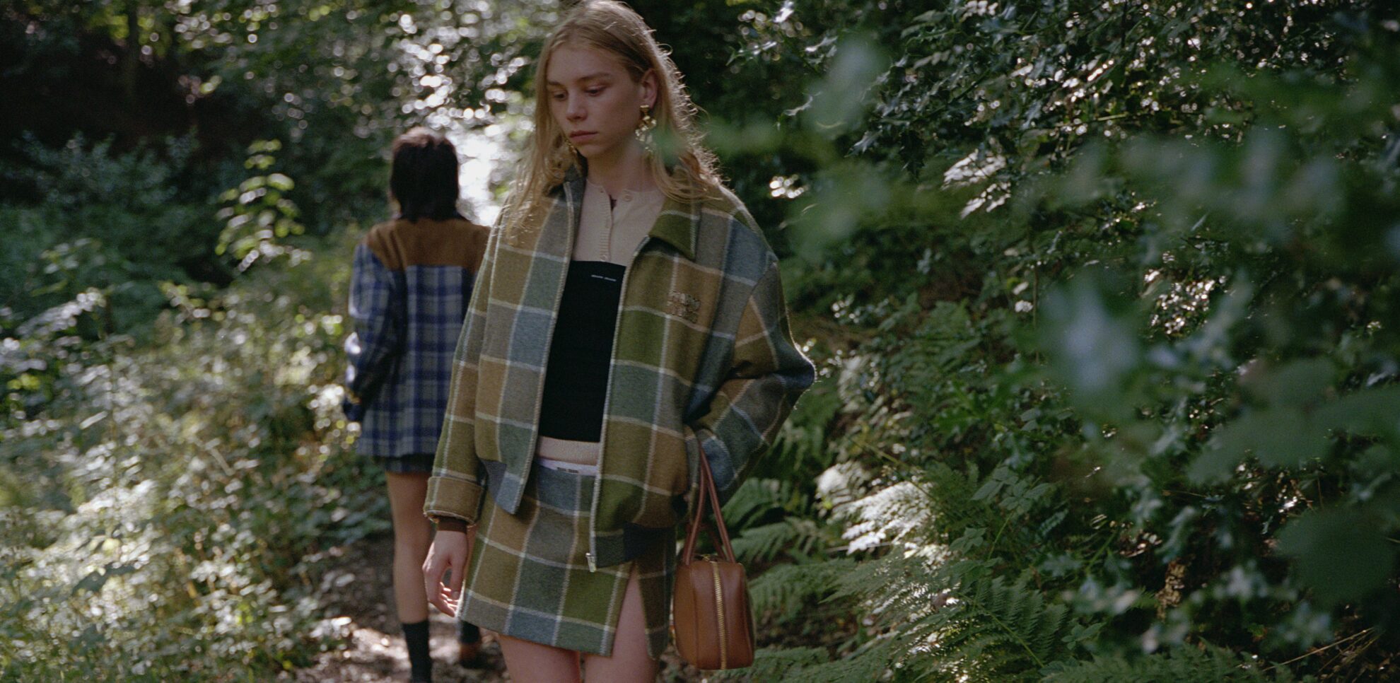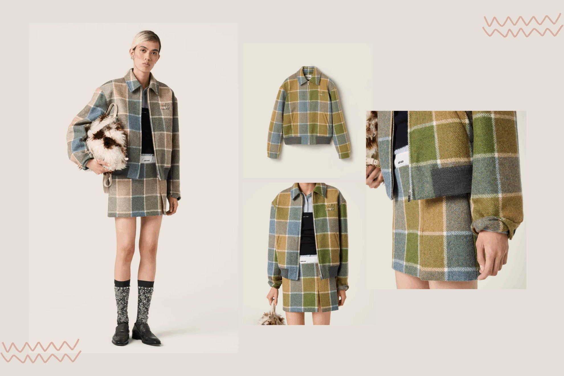 這款外套以復古格紋作主調,結合 Camel 與 Aviator Blue 的柔和色調,散發濃厚懷舊氣息。短版剪裁營造可愛又俐落的比例感,拉鍊設計及衣領細節增添中性帥氣感。