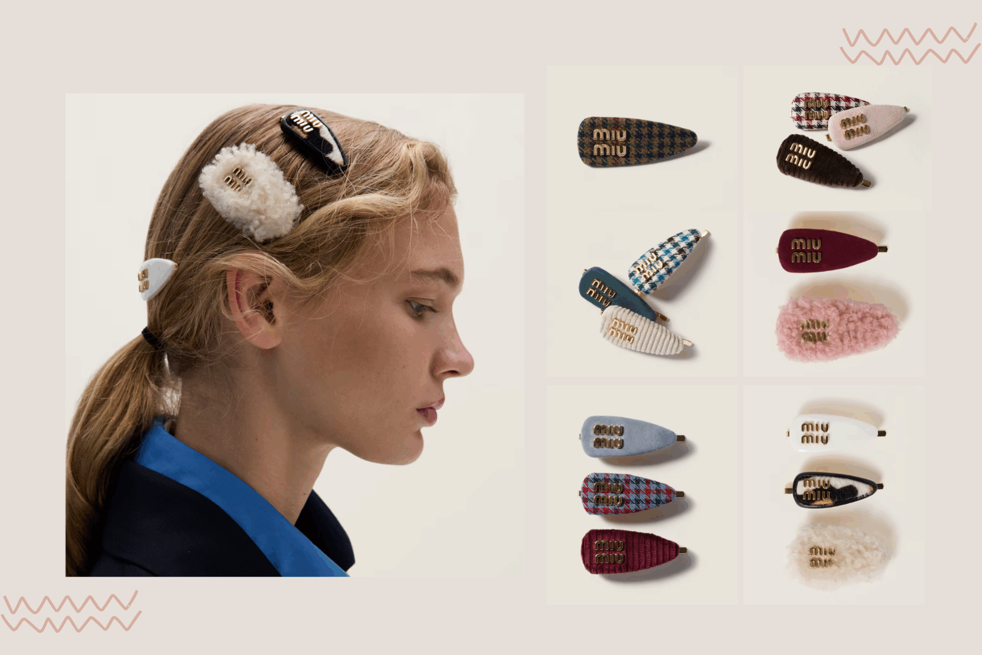 Miu Miu 髮夾以柔和色系與多重材質打造,包括格紋呢料、燈芯絨與麂皮質感,營造溫暖又復古的秋冬氛圍。當中小編推薦今季流行的粉嫩與暖棕色調(Amaranth、Peach、Ebony),令造型更顯甜美可人。無論夾於髮尾或作層次點綴,小細節都能為造型注入可愛與精緻感,而且還有多款多色選擇,是秋冬不可或缺的 finishing touch。