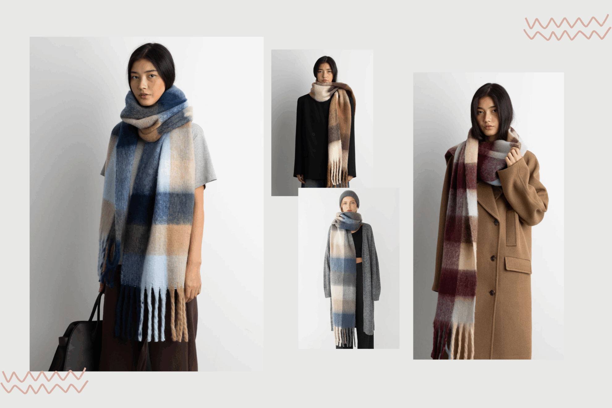 這款厚實格紋頸巾以柔軟毛感材質打造,兼具保暖與造型感。藍、駝與米色調交織出溫柔層次,視覺上柔和又具質感,點亮整個秋冬造型。