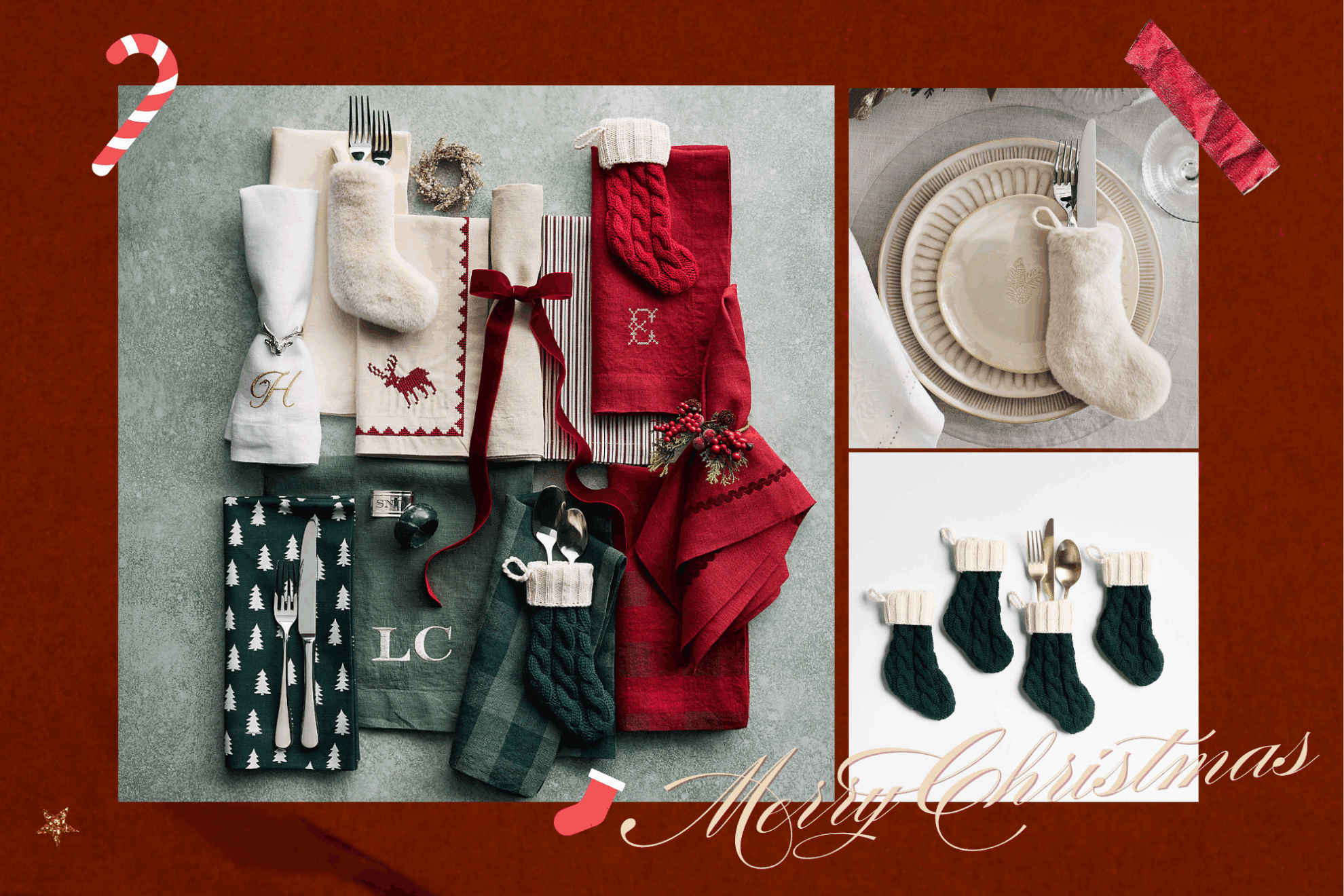 想在餐桌上加入小細節,Crate & Barrel 的節日小配件正好派上用場。Holiday Green Flatware Stockings 是迷你餐具襪,以有機棉紗編織而成,深綠色 cable knit 搭配米白色仿毛邊,帶有冬日毛衣般的溫暖感。把刀叉餐具放入小襪中,即可完成一個充滿節日氛圍的 place setting,為客人帶來小驚喜。