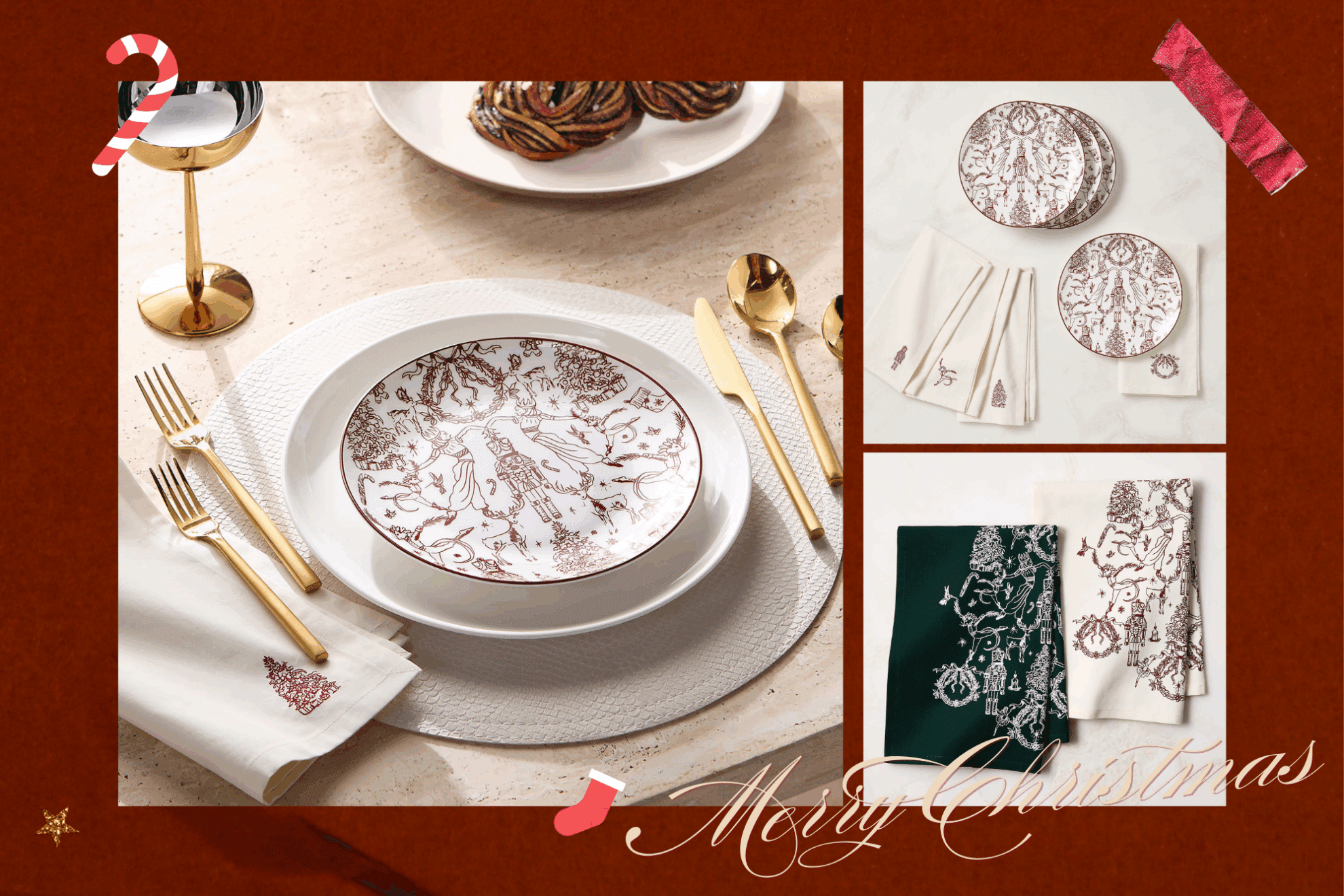 3. CB2 — Nutcracker Kingdom Red and White Appetizer Plates / Organic Cotton Tea Towel