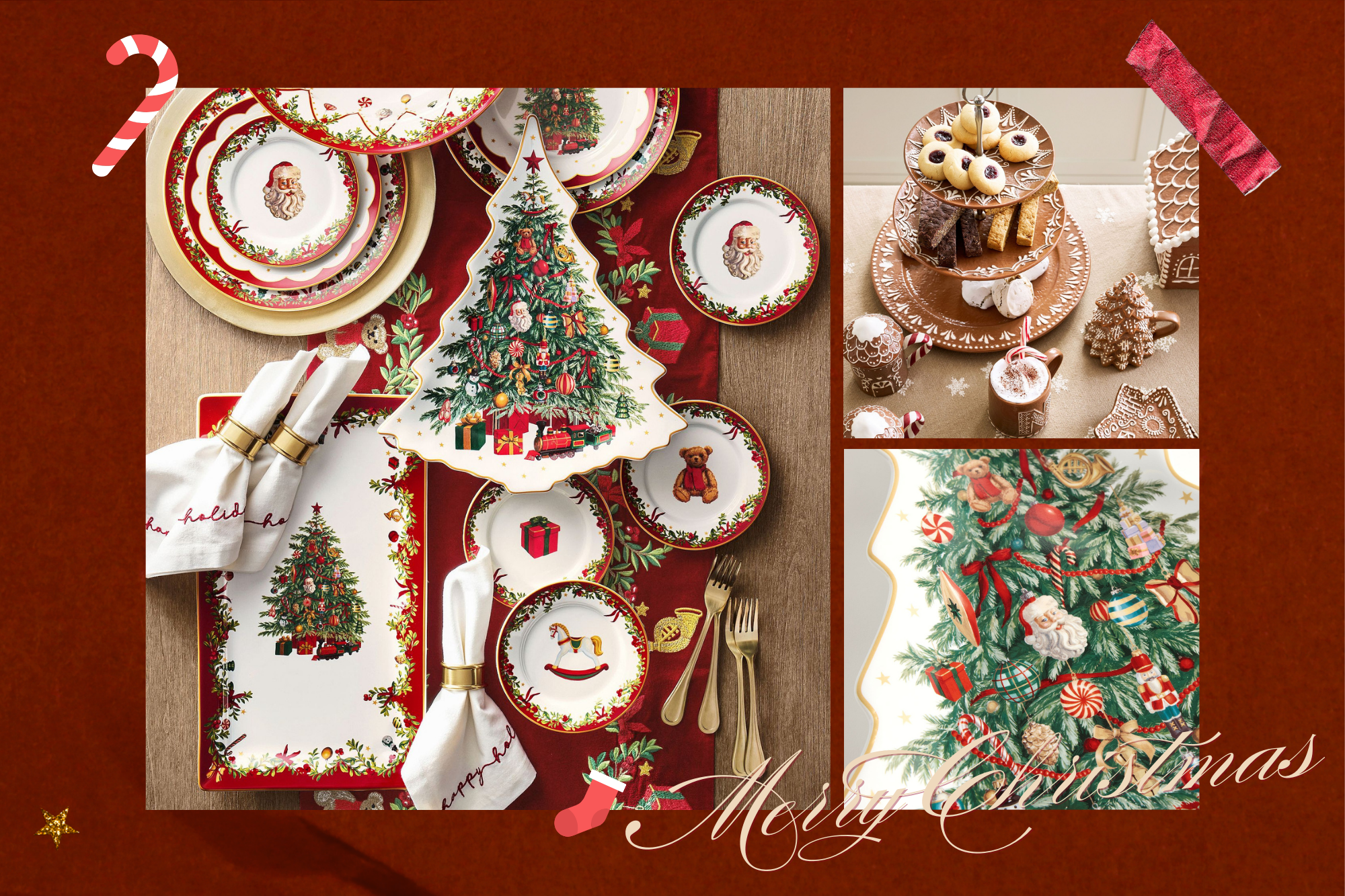4. Pottery Barn — Gingerbread Stoneware Tiered Stand / Nostalgic Christmas Icon Stoneware Serving Platter